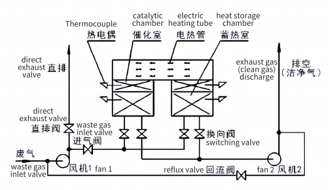 Sula dtosaíonn tú ar an bpróiseas cóireála gáis dramhaíola, déantar réamhthéamh ar an seomra téimh agus ar leaba stórála teasa na foirnéise. Tar éis réamhthéite, tá an fhoinse gáis dramhaíola ceangailte leis an trealamh. Faoi ghníomh an lucht leanúna meaitseála, téann an gás dramhaíola orgánach ar dtús le malartú teasa leis an gcomhlacht ceirmeach stórála teasa réamhthéite, isteach sa chrios teasa tar éis méadú teochta, agus ansin faigheann sé an dara méadú teochta sa chrios téimh go dtí go sroicheann teocht an gháis dramhaíola an teocht a theastaíonn don imoibriú catalaíoch. Téann an gás dramhaíola isteach sa seomra catalaíoch chun freagairt, ag giniúint dé -ocsaíd charbóin agus uisce, agus ag scaoileadh fuinnimh teasa. Déantar stóráil teasa ar an ngás glan cóireáilte leis an gcomhlacht ceirmeach stórála teasa 2 agus scaoileann an lucht leanúna é. Tar éis an teocht socraithe a bhaint amach trí bhrath teochta le teirmeachúpla ionraoin don lucht leanúna sceite, aistrítear an comhla, agus téann an gás dramhaíola isteach sa chomhlacht ceirmeach stórála teasa 2, a scaoiltear ansin ón gcomhlacht ceirmeach stórála teasa 1. athrá an timthriall seo go leanúnach. $ $ $ $ $
