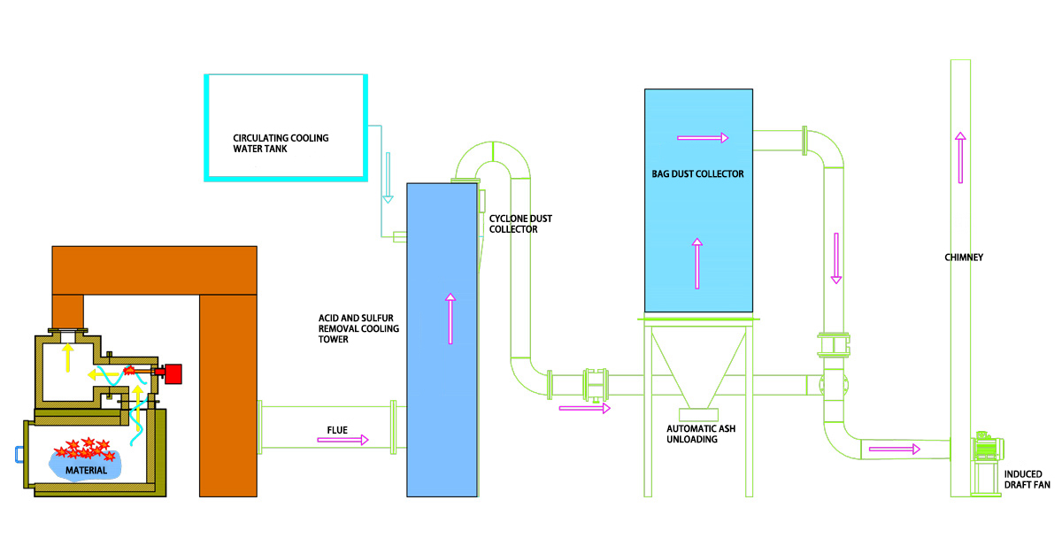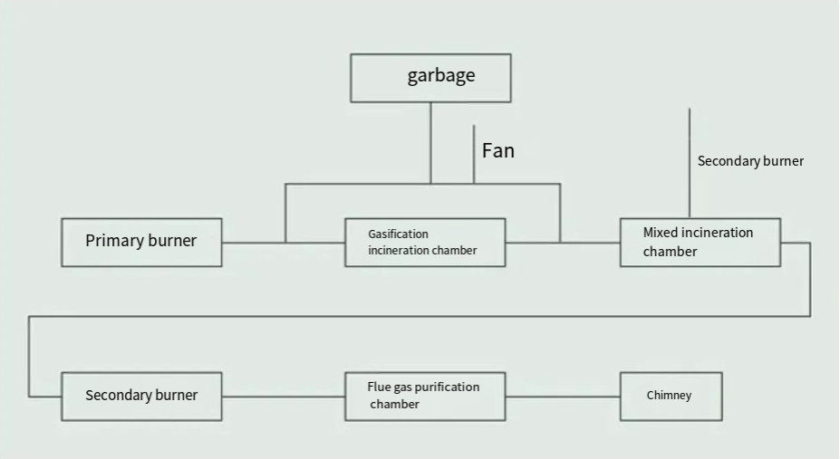 Próiseas dócháin: Téann an dramhaíl isteach sa seomra dócháin le haghaidh dó. Taobh istigh, cuirtear crios dócháin ar bun, agus tá cuid bheag den seomra dócháin tiomnaithe don phróiseas dó. Anseo, tagann an dramhaíl i dteagmháil le haer téite, agus é adhainte ag meaisín dócháin faoi rialú teochta. Ag cloí le prionsabail na dtrí Tí, am, agus suaiteacht, déantar an dramhaíl ocsaídiúcháin, pirealú agus dóchán iomlán laistigh den chorp foirnéise. Téann an gás múcháin a leanann as sin isteach i seomra dócháin thánaistigh, áit a ndéantar dó dóchán ardteochta. Tá an gás múcháin faoi réir teochtaí níos mó ná 850 ° C ar feadh 2 shoicind ar a laghad, ag cinntiú go n -éireodh sé go hiomlán le gás dochrach agus dianscaoileadh críochnúil pataiginí díobhálacha. An t -ábhar orgánach sna dócháin dramhaíola, ag giniúint teasa agus ag scaoileadh dé -ocsaíd charbóin agus gal uisce.